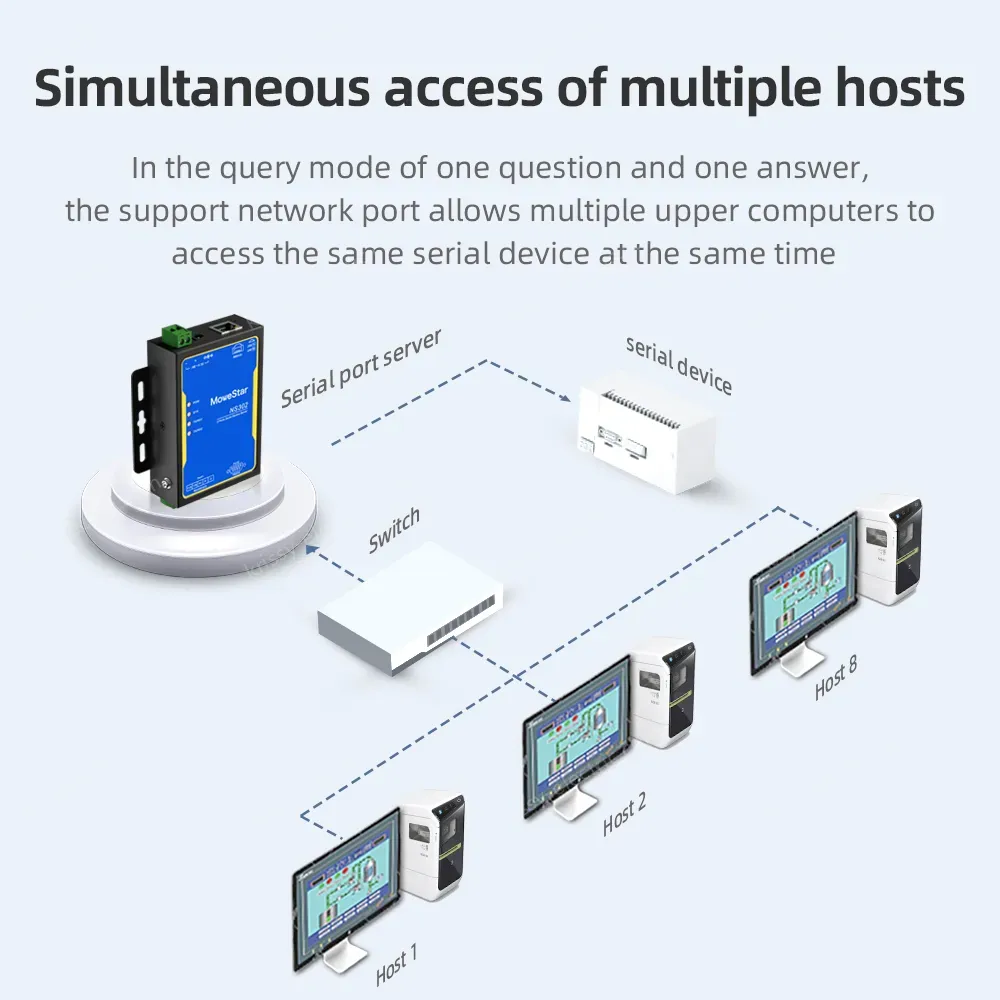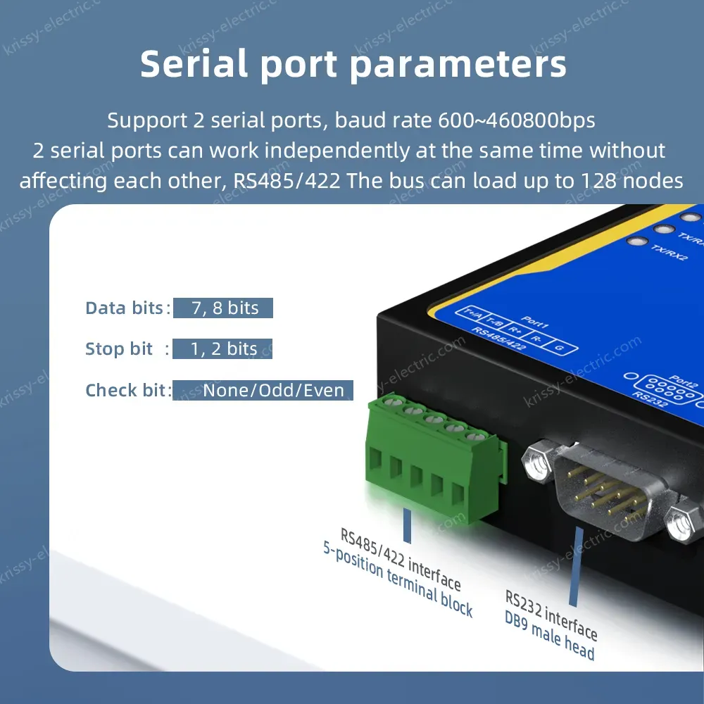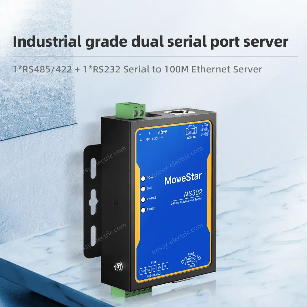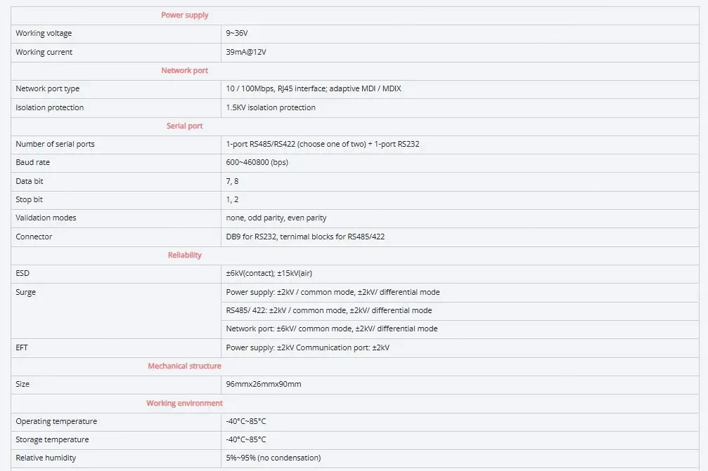 Industrial serial port server series products, mainly realize the data transmission between Ethernet and serial port (RS-232/RS-485/RS-422), it integrates the TCP/IP protocol stack, RS-232/RS-485/RS-422 devices that are not connected to the Internet can also be easily, flexibly and quickly connected to Ethernet. The series of products use high-performance ARM chip to ensure stable data transmission; Support a variety of working modes to meet different application requirements; Excellent anti-interference performance, suitable for harsh industrial environments.