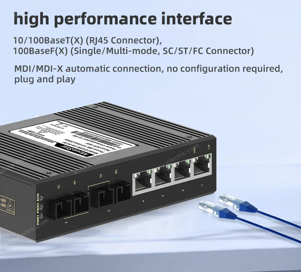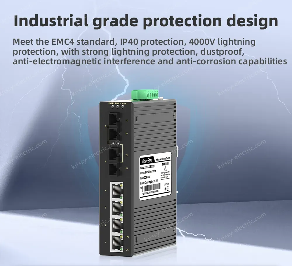 The industrial Ethernet switch adopts high-performance imported switching chip to ensure the stable transmission of large traffic data, and supports 10/100/100M adaptive electrical port; Support -40~85℃ operating temperature, industrial power protection, indicator status display, guide rail/rack installation, fan-less thermal housing design, to achieve real readout, convenient and fast, but also meet the EMC4 level protection, IP40 protection, 6000V lightning protection and other indicators, can adapt to a variety of harsh industrial environment application needs.